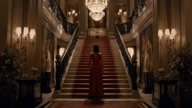 SymmetricalBalanced composition with mirrored elements on both sidesSymmetrical scene of a staircase in the center with grand luxurious decor on each side. A woman in a long red dress is walking up the staircase slowly, facing away from the camera. Exact symmetry horizontal symmetry.  Raw indie film aesthetic. Heavy grain. Unpolished, authentic, low-budget realism with a surreal, observational feel.
