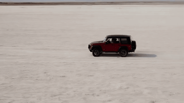Negative spaceEmpty space around the subject that draws attention to themNegative space scene, shot from above of a vast dried salt lake with a dark red jeep driving slowly. The composition frames the jeep extremely small against the environment of the salt lake, emphasizing the negative space. Raw indie film aesthetic. Heavy grain. Unpolished, authentic, low-budget realism with a surreal, observational feel.